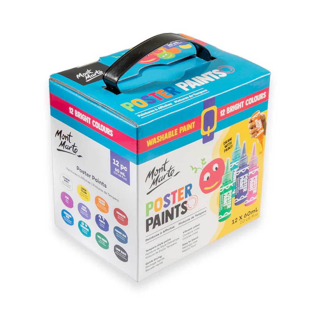 Little artists can set their creativity free at home or in the classroom with our Poster Paints 12pc. Inside the set are 12 solid poster paint colours that blend and mix smoothly and dry quickly to a semi-opaque finish. The paint bottles are designed for little hands to use and squeeze. Kids can hold them like a drawing tool, so no brushes are needed! Best of all, these paints are washable and non-toxic, so you can rest easy knowing this poster paint set is safe for kids and washes off easily with a bit of warm soapy water.