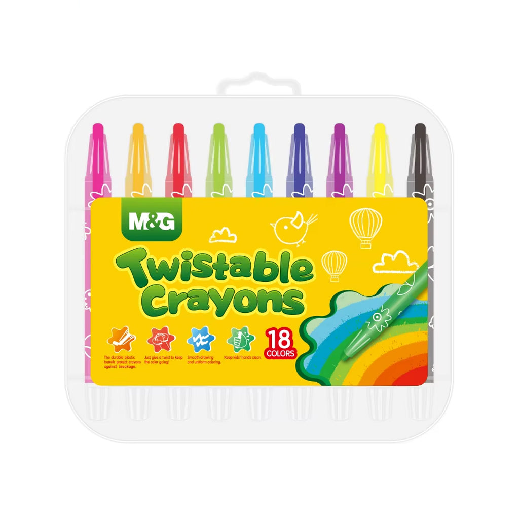 M&G Twistable Crayon 18 Colors Available in 12/18/24 colors crayons PP Box Packaging No sharpening or peeling required simply twist the durable plastic barrels Keep kids...