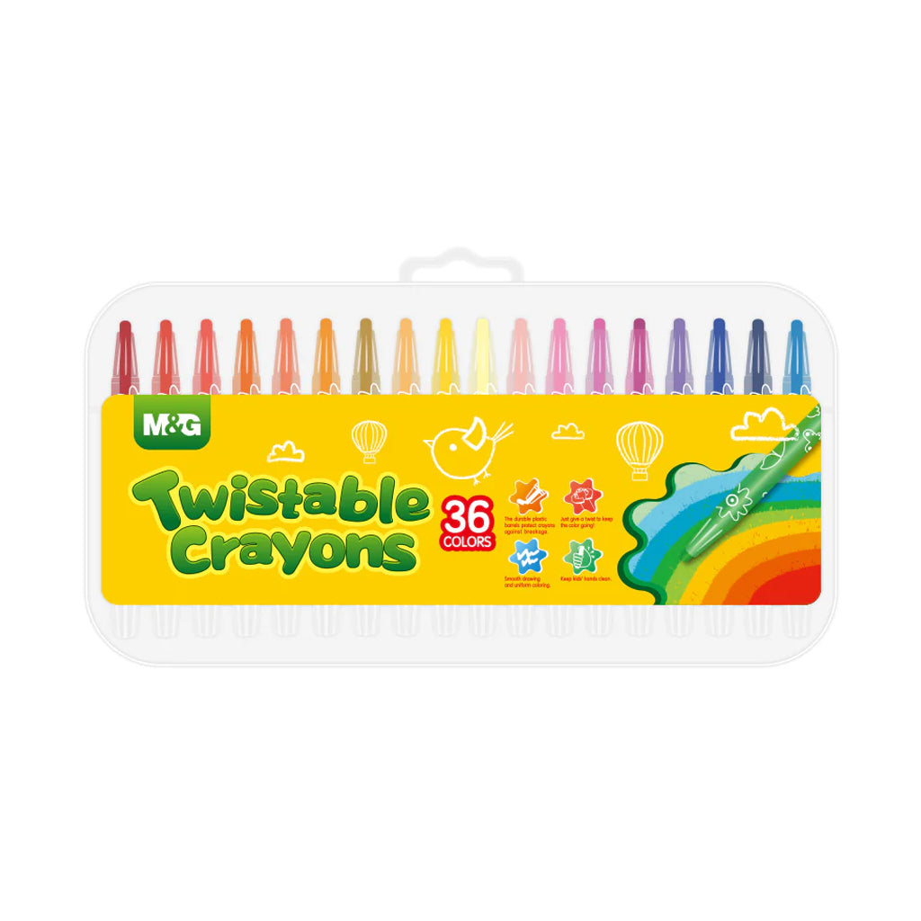 M&G Twistable Crayon 36 Colors Available in 12/18/24 colors crayons. PP Box Packaging. No sharpening or peeling required simply twist the durable plastic barrels. Keep Kids...
