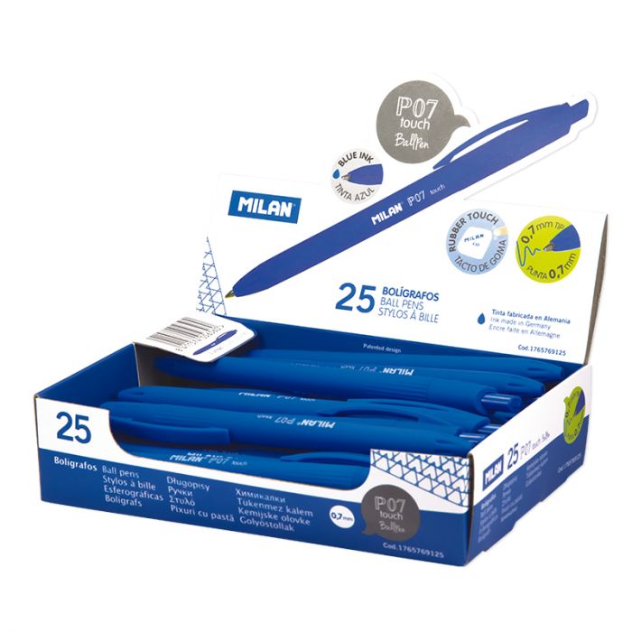 Blue P07 touch pen. The barrel is the same colour as the ink. Approximate writing length of 1,300 metres. 0.7 mm tip. Ink manufactured in Germany....