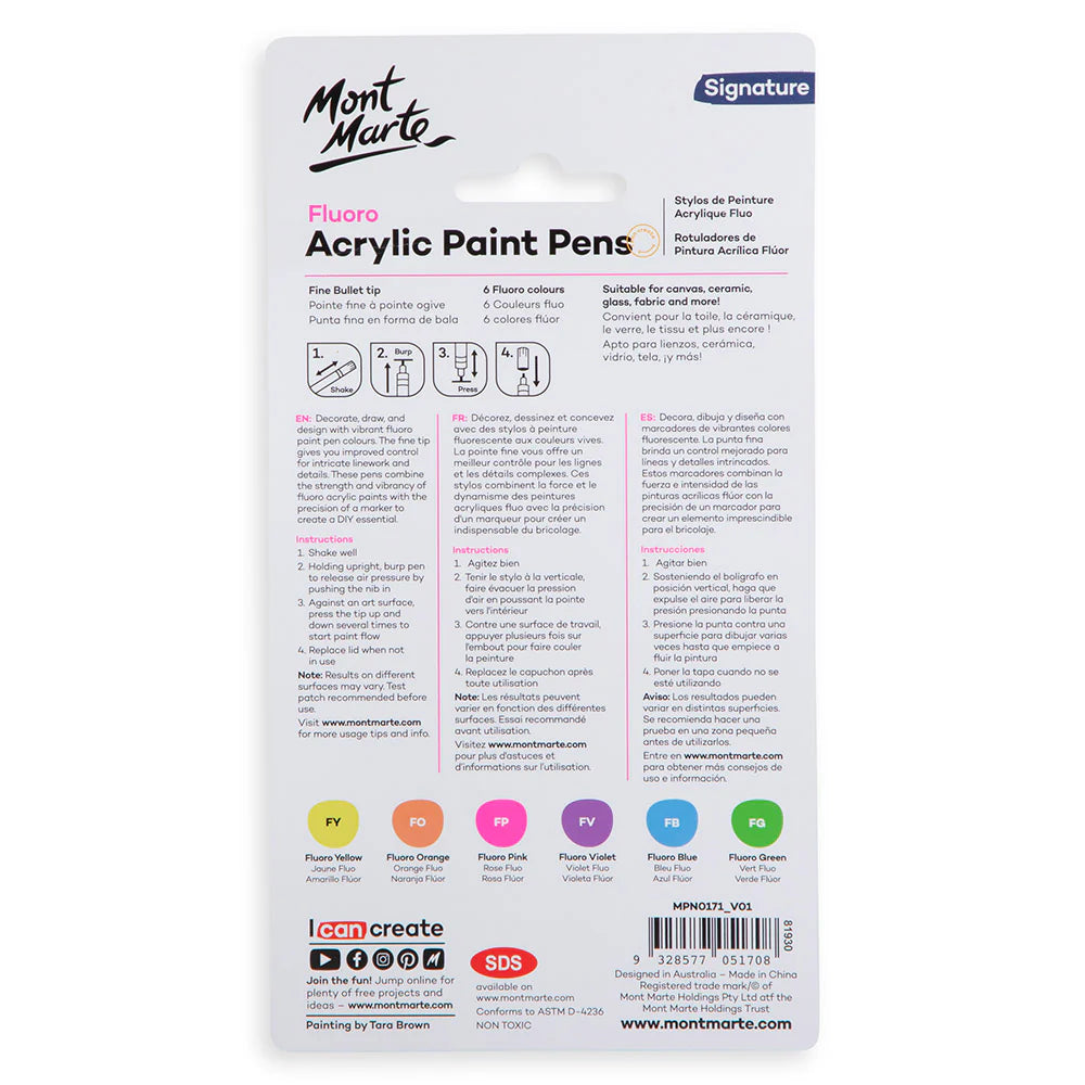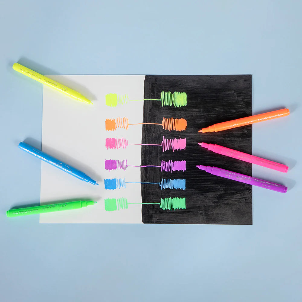 Acrylic marker pens in 6 fluoro colours – Fluoro Yellow, Fluoro Orange, Fluoro Pink, Fluoro Violet, Fluoro Blue, Fluoro Green